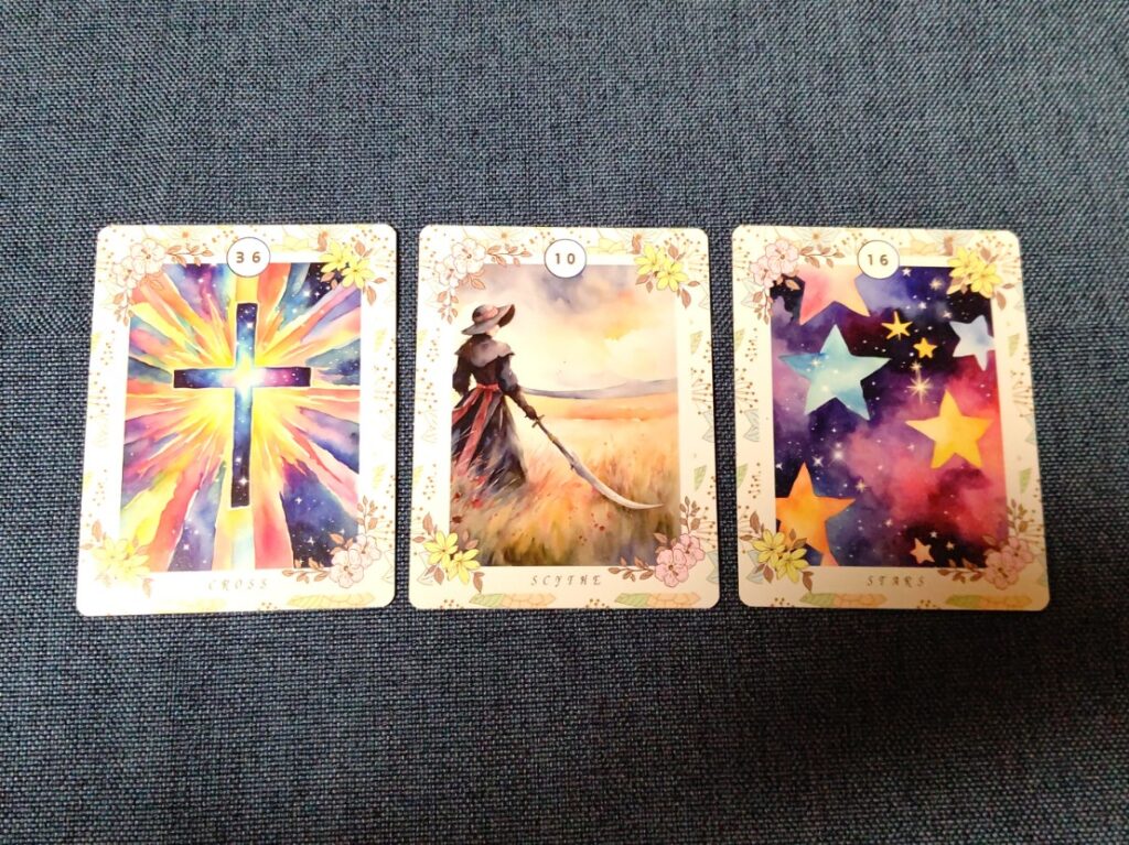 これはなかなか良いカードが出ました。重圧がサクッと終息して希望が現れた、みたいな。苦労して育てた作物を刈り取って、これから売ってお金稼ごうかなという感じですね。自分の食料にもなるし。